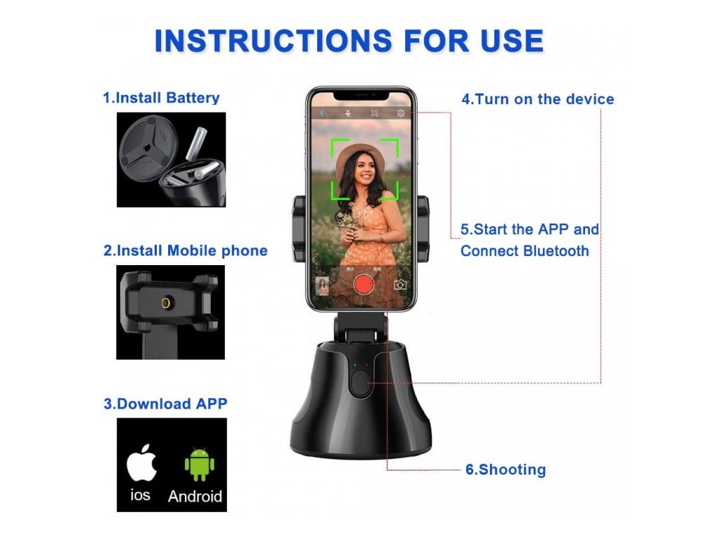 Přenosný, multifunkční, automatický, inteligentní držák telefonu s 360 otáčkami, automatické sledování obličeje, sledování objektů. Ideální pro vlogy! S tímto inteligentním AI gimbalem senzujte své fotografie smartphonu. Získejte šíleně kreativní GIFy, fotografie a videa. Maximalizujte možnosti fotoaparátu smartphonu pomocí režimů Auto-tracking, Smart Capture a 9 Quick Create. Po přepnutí do režimu sledování obličeje dokáže automaticky rozpoznat vaši tvář , ať jste kdekoli. Zachyťte krásná, bezproblémová panoramata bez použití rukou. A teď v nich můžete být také!