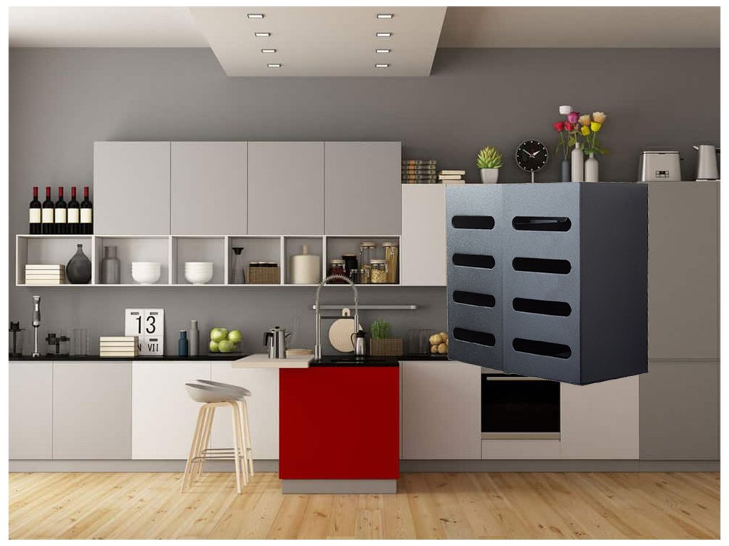 Organizér se připevňuje na stěnu, takže ušetříte spoustu místa na kuchyňské lince. Poličku lze připevnit pomocí lepidla nebo pomocí hmoždinek a šroubů, které jsou součástí sady.